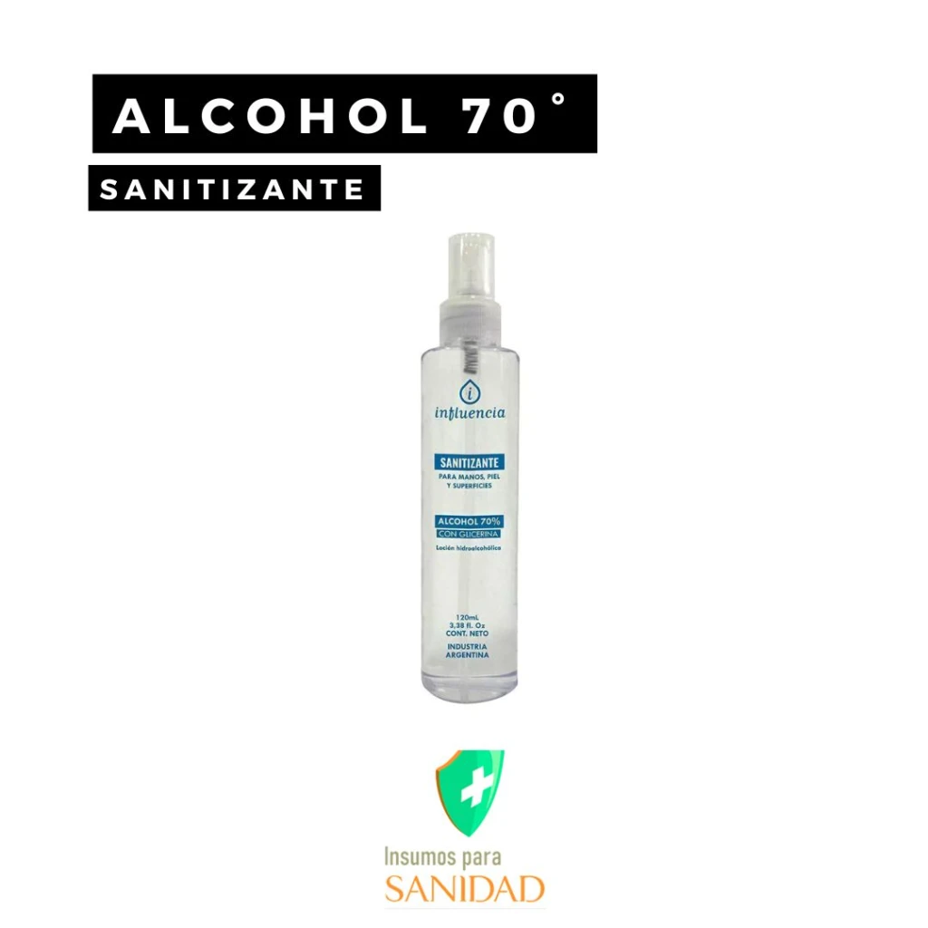Loción Sanitizante -Alcohol al 70%- x 120 ml con spray Influencia